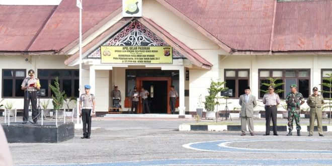 REDELONG : Plt Bupati Kabupaten Bener Meriah Drs. Hasanuddin Darjo, MM yang diwakili oleh Asisten Ekonomi Pembangunan Setdakab Bener Meriah Drs. Mukhlis mengikuti Apel Operasi Lilin Rencong Tahun 2016 di Polres Bener Meriah, Jum’at (23/12)