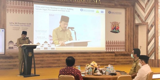 BANDA ACEH – Asisten II Sekda Aceh, Ir. Mawardi, membuka Meeting & Capacity Building Satuan Tugas (Satgas) Percepatan Investasi Aceh, di Kantor Perwakilan Bank Indonesia Provinsi Aceh, Selasa (28/09/2021). “Kegiatan ini sangat penting sebagai salah satu upaya untuk meningkatkan kapasitas Satgas Percepatan Investasi Aceh dalam rangka pengelolaan promosi proyek investasi di Aceh,” kata Mawardi.