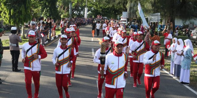 JANTHO – Syahrial, Legenda olahraga Aceh Besar, ramah menyapa ratusan masyarakat dan pelajar sambil berlari membawa Obor Api PON XXI, untuk diserahkan kepada Penjabat Bupati Aceh Besar Muhammad Iswanto selaku Pembina Upacara, yang telah menantinya di panggung kehormatan. Tim Kirab Api PON XXI kompak mengiringnya di sisi, Kamis (5/9/2024) sore.