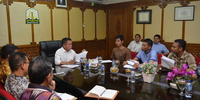 Banda Aceh – Gubernur Aceh Irwandi Yusuf menerima Aliansi Mahasiswa Pemuda Peduli Aceh Singkil di Ruang Rapat Gubernur, Kamis (12/04/2018). Kedatangan para mahasiswa itu untuk menyampaikan persoalan terkait konflik lahan antara masyarakat dengan PT. Delima Makmur yang beroperasi di Kabupaten Singkil.