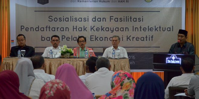 Banda Aceh – Sedikitnya 100-an pelaku ekonomi kreatif di Banda Aceh mendapatkan pendampingan oleh Badan Ekonomi Kreatif (Berkaf), UI dan Pemko untuk mendapatkan Hak Kekayaan Intelektual (HKI) atas karya-karya mereka. Kegiatan Sosialisasi dan Fasilitasi HAKI Bagi Pelaku Ekonomi Kreatif di gelar di Hotel The Pade dan dibuka Assisten Keistimewaan Ekonomi dan Pembangunan Setdakota Banda Aceh, Ir Gusmeri MT, Rabu (9/11/2016).