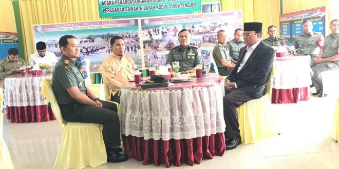 TAKENGON : Pagi ini di ruang aula Kodim 0106 AT-BM Bupati Bener Meriah Ahmadi, SE bersama Danrem 011 Lilawangsa Kolonel (INF) Agus Yusmono, S.I.P dan Dandim 0106 AT-BM Letkol (INF) Didit Hari Prasetyo Putro, S.I.P tanda tangani nota kerjasama (MoU) percetakan sawah baru di Kabupaten Bener Meriah tepatnya di Kampung Alur Gading dan Kampung Negeri Sayeung Kecamatan Pintu Rime Gayo (21/7/2017).