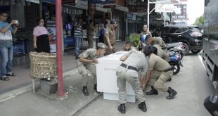 Humas Aceh | 27 Sep 2017 Banda Aceh – Petugas Satpol PP/WH Kota Banda Aceh menertibkan trotoar di sepanjang area depan pertokoan di Jalan Tgk Chik Ditiro, Peuniti, Rabu (27/9/2017). Selama ini, trotoar di kawasan tersebut yang seharusnya diperuntukkan bagi pejalan kaki, digunakan sebagai lapak jualan oleh para pedagang maupun pemilik toko.