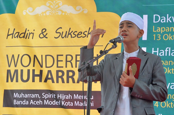 Syakir Daulay, dai Cilik asal kota Juang Bireuen, Aceh menjadi perhatian kusus puluhan ribu jama’ah yang sedang mengikuti peringatan tahun baru islam 1 Muharram yang dipusatkan di Lapagan Blang Padang Banda Aceh, Selasa (13/10/2015).