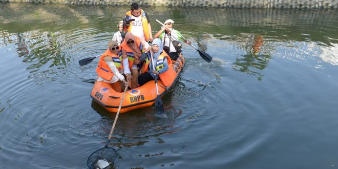 Pembersihan dilakukan dengan menaiki perahu karet dan memungut sampah yang mengambang di sungai dengan menggunakan jarring.