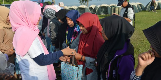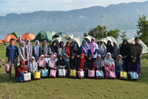 Ketua Penggerak PKK Aceh, Darwati A Gani menyerahkan santunan untuk puluhan anak yatim dari Yayasan Kasih Sayang pada kegiatan reunian bertajuk ‘Camping Religi’ di Kota Takengon, Minggu, 18/03/2018. Bantuan sosial itu diberikan Darwati bersama rekan sealmamater di Kampus PDPK Unsyiah, angkatan tahun 1991.
