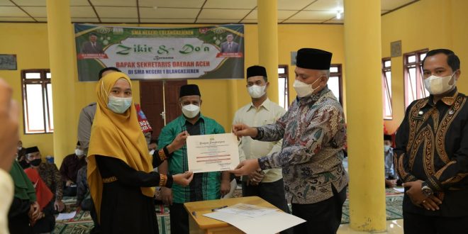 BLANGKEJEREN – Tiga Kepala Sekolah dan 15 Wali Kelas di Gayo Lues menerima Piagam Penghargaan Capaian Vaksin di atas 75 persen dari Sekretaris Daerah (Sekda) Aceh, dr Taqwallah MKes mewakili Pemerintah Aceh, usai kegiatan rutin dzikir dan do’a dan zikir tolak bala Covid-19 yang berlangsung di SMA Negeri 1 Blangkejeren, Kamis (7/10).