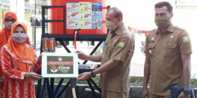 Aceh Besar – Ketua Dharma Wanita Persatuan Aceh Safrida Yuliani, menyerahkan 1 unit tempat cuci tangan atau wastafel portable ke Pasar Lambaro, Ingin Jaya, yang diterima langsung oleh Kepala Dinas Perindustrian dan Perdagangan Aceh Besar Taufik didampingi Camat Ingin Jaya Kamil Zuhri, Senin (20/4/2020).