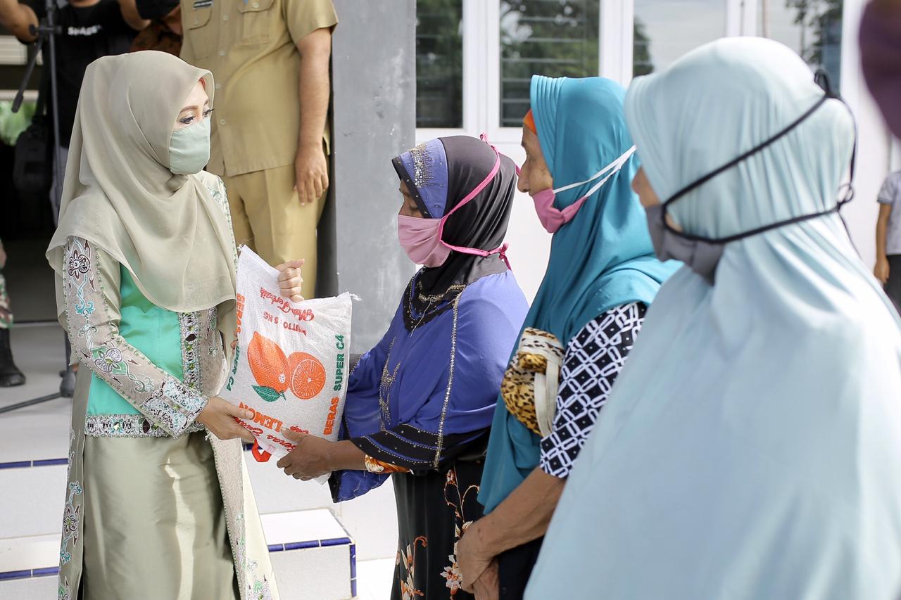 Wakil Ketua Gugus Tugas Penanganan Covid-19 Aceh, Dyah Erti Idawati, didampingi Ketua Tim Penggerak PKK Aceh Jaya, Ernani Wijaya dan Sekda Kabupaten Aceh Jaya, Mustafa Ibrahim, membagikan bantuan sosial berupa sembako untuk masyarakat kurang mampu di Kecamatan Tunom, di Aula Kantor Camat Teunom, Kabupaten Aceh Jaya, Senin, (8/6/2020).