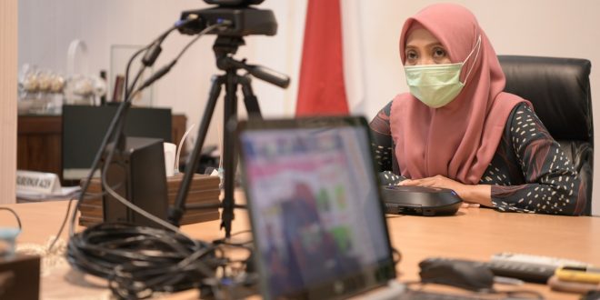 Wakil Ketua TP-PKK Aceh Dyah Erti Idawati menjadi pemateri pada kegiatan Seminar Sosialisasi Gebrak Masker bersama seluruh penyuluh Kotaku Aceh yang digelar secara daring di Pendopo Wakil Gubernur Aceh, Banda Aceh, Selasa (1/9/2020).