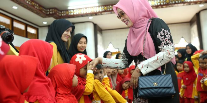 Banda Aceh– Bunda Pendidikan Anak Usia Dini (PAUD) Aceh, Dyah Erti Idawati, menyemangati dan memotivasi anak-anak TK Medina Bilingual School yang datang berkunjung ke Pendopo Gubernur Aceh, Rabu, (5/2). Anak-anak pun tampak ceria dan antusias mendengarkan sambutan istri orang nomor satu di Aceh itu.