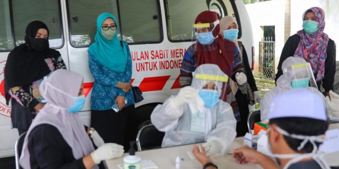 Aceh Besar – Wakil Ketua Tim Gugus Tugas Percepatan Penanganan Covid-19 Aceh, Dyah Erti Idawati, meninjau pelaksanaan rapid test Covid-19 yang digelar di Puskesmas Montasik, Aceh Besar, Kamis (23/4).