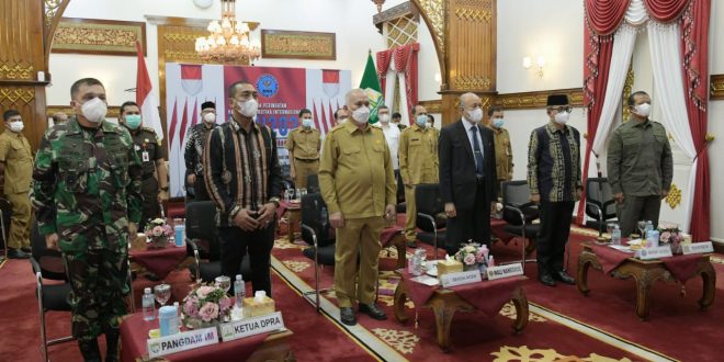 Banda Aceh – Forum Koordinasi Pimpinan Daerah (Forkopimda) Aceh memperingati Hari Anti Narkotika Internasional (HANI) 2021 yang digelar secara daring dari Balai Besar Rehabilitasi BNN Lido, Kabupaten Bogor, Senin (28/6/2021).