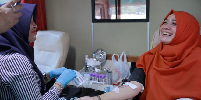 Banda Aceh – Ketua Yayasan Kanker Indonesia (YKI) Aceh, Darwati A Gani mendonorkan darahnya saat menghadiri peringatan World Cancer Day di Lapangan Blang Padang, Banda Aceh, Minggu 4 Februari 2018.