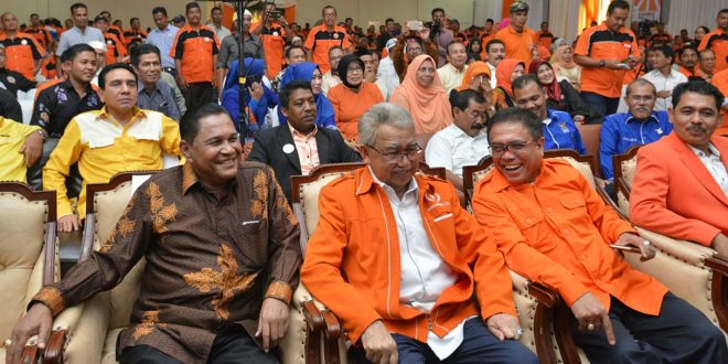 Gubernur Aceh, dr. H. Zaini Abdullah berbincang bersama ketua Dewan Pembina Partai Nasional Aceh (PNA), Irwandi Yusuf disela-sela membuka Kongres I PNA 2017 dengan Tema Berbenah Diri Menuju Partai Kader, Demokrasi dan Modern, diGedung Amel Convention Banda Aceh, Senin. 1-5-2017.