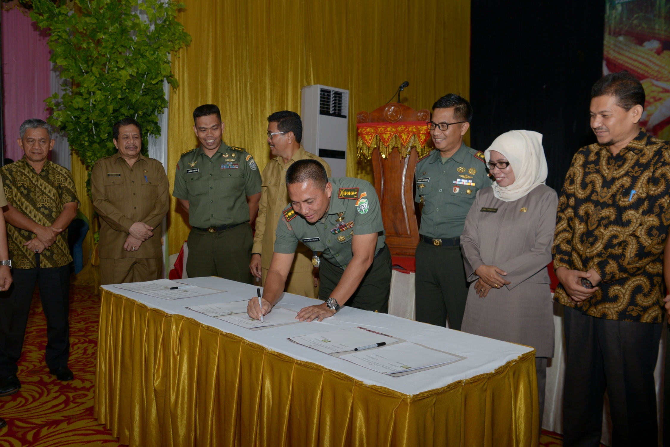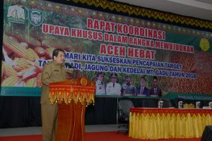 Sekretaris Daerah Aceh, Drs. Dermawan. MM. menyaksikan penandatanganan perjanjian kerjasama perluasan sawah tahun 2018, pada pembukaan Rakor upaya khusus dalam rangka mewujudkan aceh hebat, di Amel Convention, Banda Aceh, 8/5/2018.