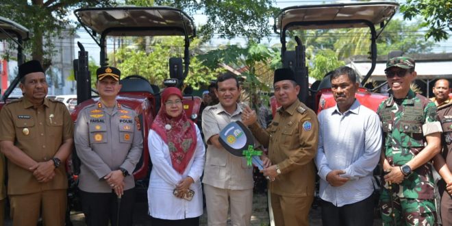 Wakil Gubernur Aceh, Fadhlullah, SE, didampingi Kadistanbun Aceh, Ir. Cut Huzaimah, MP, saat menyerahkan bantuan alat mesin pertanian traktor dari Kementerian Pertanian RI kepada Pemda Pidie Jaya, yang diterima langsung Oleh Bupati Pidie Jaya, H. Sibral Malasyi, MA, S.Sos, ME, yang turut disaksikan Unsur Forkopimda Pidie Jaya, di Kabupaten Pidie Jaya, Senin, (28/7/2025).