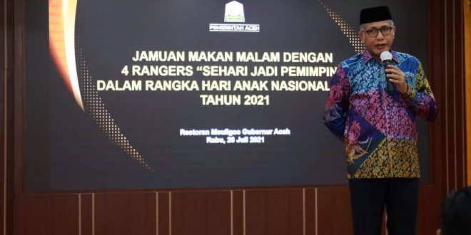 Gubernur Aceh Ir.H.Nova Iriansyah, MT Memberikan Sambutan dan Arahan pada Jamuan Makan Malam dengan 4 RANGERS "SEHARI JADI PEMIMPIN" dalam rangka Hari Anak Nasional Aceh Tahun 2021 di Restoran Meuligoe Gubernur Aceh, Banda Aceh, Rabu, (28/7/2021).