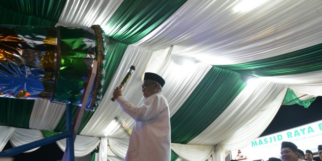 Gubernur Aceh, dr. H. Zaini Abdullah memukil beduk saat melepas peserta pawai takbir memperingati Hari Raya Idul Fitri di depan Masjid Raya Baiturrahman, Banda Aceh, 24 Juni 2017. Humas Aceh/Zulkarnain