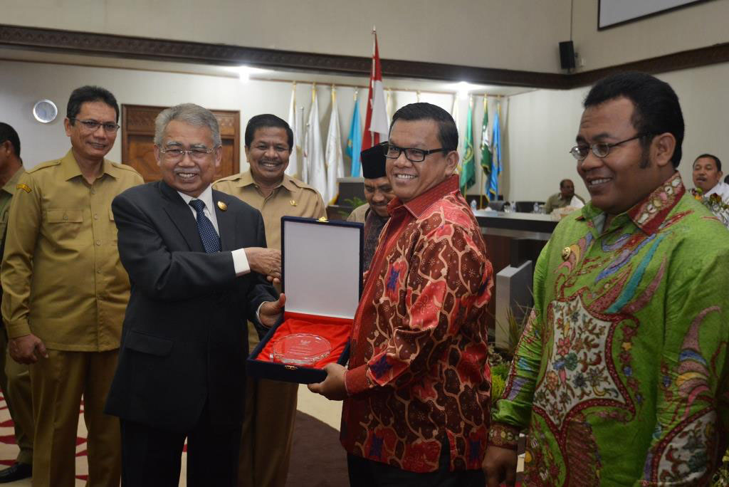 Gubernur Aceh, Zaini Abdullah menyerahkan Anugerah Prof. Majid Ibrahim kepada Kabupaten Aceh Barat Daya atas prestasi penyusunan Rencana Kerja Pembangunan Daerah, Musyawarah Perencanaan Pembangunan (musrenbang) Rencana Kerja Pemerintah Aceh (RKPA) tahun 2018 di Gedung Dewan Perwakilan Rakyat Aceh, Banda Aceh, Senin (17/4/2017).