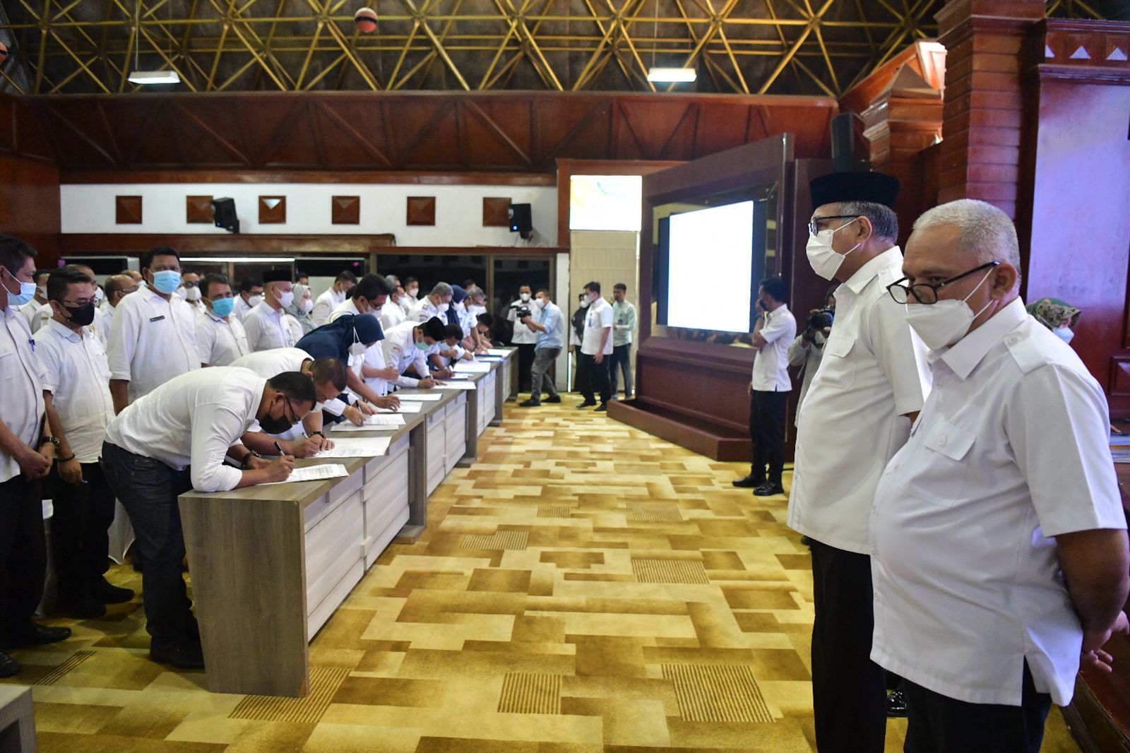 Gubernur Aceh, Ir. H. Nova Iriansyah, MT didampingi Sekretaris Daerah Aceh, dr. Taqwallah, M. Kes menyaksikan Penandatanganan Pakta Integritas Kepala SKPA, KPA,PPTK dan Bendahara Terpilih di Lingkungan Pemerintah Aceh, di Anjong Monmata, Banda Aceh, Rabu (26/1/2022).