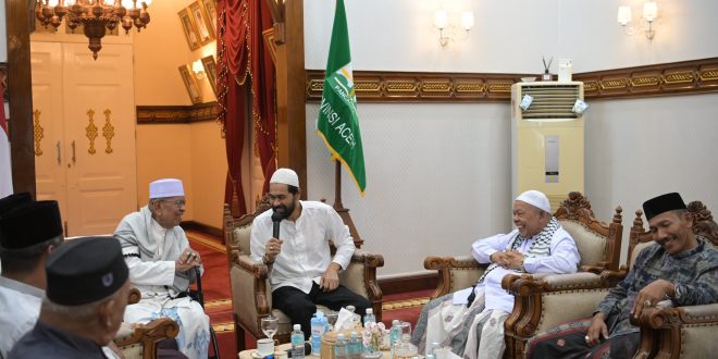 BANDA ACEH— Gubernur Aceh, Muzakir Manaf atau Mualem, menerima kunjungan silaturahmi para ulama yang terhimpun dalam organisasi Majelis Ulama Nanggroe Aceh (MUNA), di Meuligoe Gubernur, Sabtu, (23/8/2025).