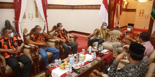 BANDA ACEH – Gubernur Aceh Nova Iriansyah, menerima kunjungan silaturahmi Pengurus Majelis Permusyawaratan Wilayah Pemuda Pancasila (MPW PP) Aceh, di ruang tengah Meuligoe Gubernur Aceh, Kamis (27/1/2022) siang tadi.