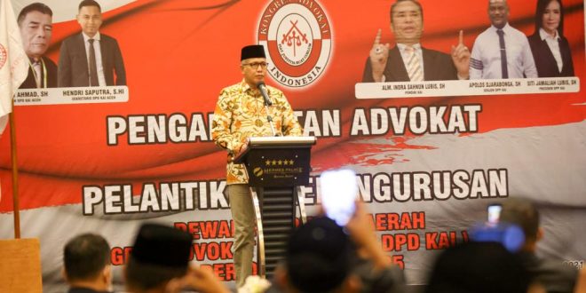 Dalam sambutannya, Gubernur Aceh menegaskan, bahwa sebagai negara hukum, yang menempatkan prinsip kesamaan di depan hukum sebagai sebuah prinsip yang sangat fundamental. Negara menegaskan bahwa setiap orang berhak atas pengakuan, jaminan, perlindungan dan kepastian hukum yang adil serta perlakuan yang sama di hadapan hukum. “Undang-undang Nomor 18 Tahun 2003 tentang Advokat disebutkan bahwa, status advokat adalah penegak hukum, bersama dengan penegak hukum lain, yaitu kepolisian dan kejaksaan serta lembaga peradilan. Dalam kaitannya dengan penegasan ini, maka peran dan fungsi advokat menjadi sangat penting,” ujar Gubernur.