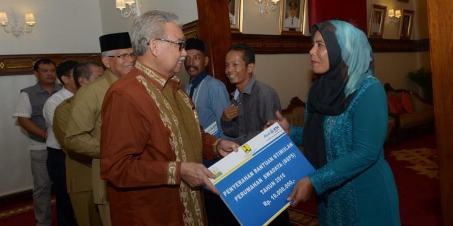 Banda Aceh – Gubernur Aceh, dr. H. Zaini Abdullah menyerahkan Bantuan Stimulan Perumahan Swadaya (BSPS)  dari Kementerian PU dan Perumahan Rakyat kepada Masyarakat empat Kabupaten  dan Dua Kota di Aceh secara simbolis di Pendopo Gubernur Aceh, Selasa (18/10)