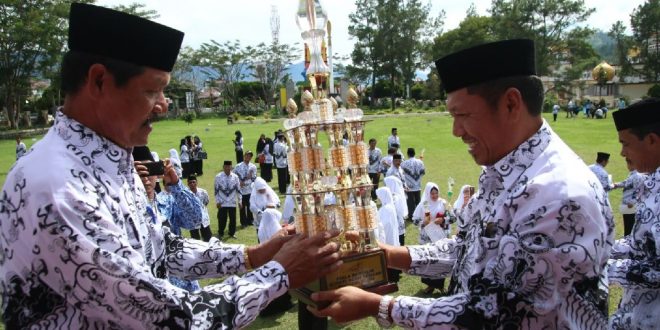 Usai memimpin upacara HGN, Plt Bupati Aceh Tengah, Drs H Alhudri MM turut menyerahkan hadian berupa piala bergilir Porseni kepada juara umum UPTD Bebesen.