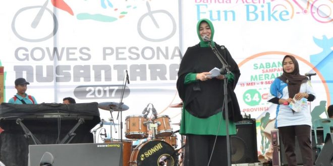 Banda Aceh – Walikota Banda Aceh, Hj Illiza Sa’aduddin Djamal SE menyambut pesepeda nasional yang merupakan peserta Gowes Nusantara. 15 peseda ini berbaur dengan ribuan peserta Banda Aceh Fun Bike dan disambut oleh Illiza di Lapangan Blang Padang, Minggu (14/5/2017).