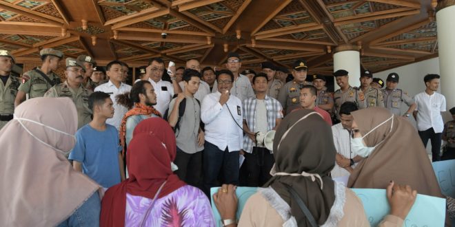 Banda Aceh- Juru Bicara Pemerintah Aceh, Saifullah Abdulgani, menerima aksi demo puluhan mahasiswa yang tergabung dalam aliansi mahasiswa dan pemuda Subulussalam (AMPES) di Halaman Kantor Gubernur Aceh, Banda Aceh, Jumat, 27/12.