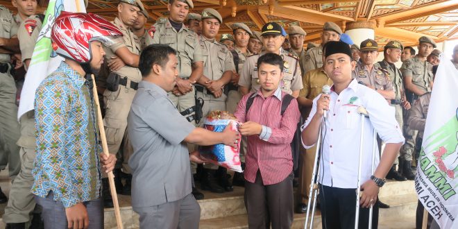 Banda Aceh – Kepala Biro Humas dan Protokol Setda Aceh, Mulyadi Nurdin, Lc, MH menerima demo Mahasiswa Kesatuan Aksi Mahasiswa Muslim Indonesia (KAMMI) di depan Kantor Gubernur Aceh, Senin (20/3).