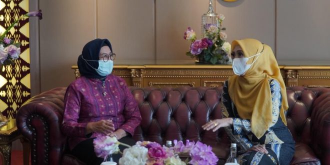 PALEMBANG – Ketua Dekranasda Aceh, Dr Ir Dyah Erti Idawati MT melakukan kunjungan kerja ke Palembang Sumatera Selatan, Senin (29/11/2021). Kedatangan Dyah Erti dan rombongan disambut langsung oleh Ketua Harian Dekranasda Sumatera Selatan Ir Hj. Ernila Rizar.