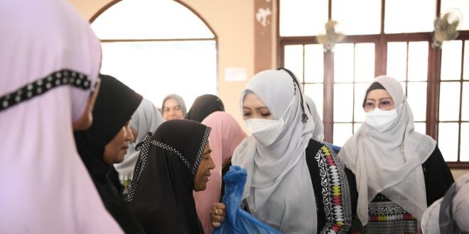 BANDA ACEH – Ketua Badan Kontak Majelis Taklim (BKMT) Aceh, Dyah Erti Idawati, menyantuni belasan anak yatim dan masyarakat kurang mampu di Perumnas Neuhen, Gampong Neuhen, Kecamatan Mesjid Raya, Sabtu (9/4/2022).