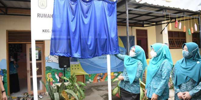 Ketua TP-PKK Aceh, Dyah Erti Idawati, didampingi Ketua TP-PKK Kota Banda Aceh, Nurmiati AR, meresmikan Pilot Project Model Implementasi Rumoh Gizi Gampong (RGG) yang ditandai dengan penarikan selubung papan nama di Gampong Lamlagang, Kecamatan Banda Raya, Banda Aceh, Selasa (6/7/2021).