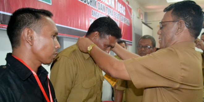 TANDA PESERTA: Asisten Pemerintahan, Drs. Zahri, M.AP, mengalungkan tanda peserta disela-sela Pembukaan Pembekalan Tugas bagi Keuchik dan TPG Angkatan II Tahun 2017 di Aula Dinas SI Aceh Timur di Idi, Selasa 25 Juli 2017.