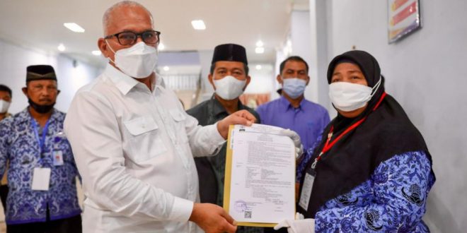 Sekda Aceh, dr. Taqwallah, M.Kes saat menyerahkan SK kepada Jufni yang merupakan Guru SD Negeri Suka Makmur Singkil, pada penyerahan SK Pensiun dan SK Kenaikan Pangkat bagi 449 ASN yang digelar di Kantor Bupati Aceh Barat Daya, Kamis (17/3/2022).