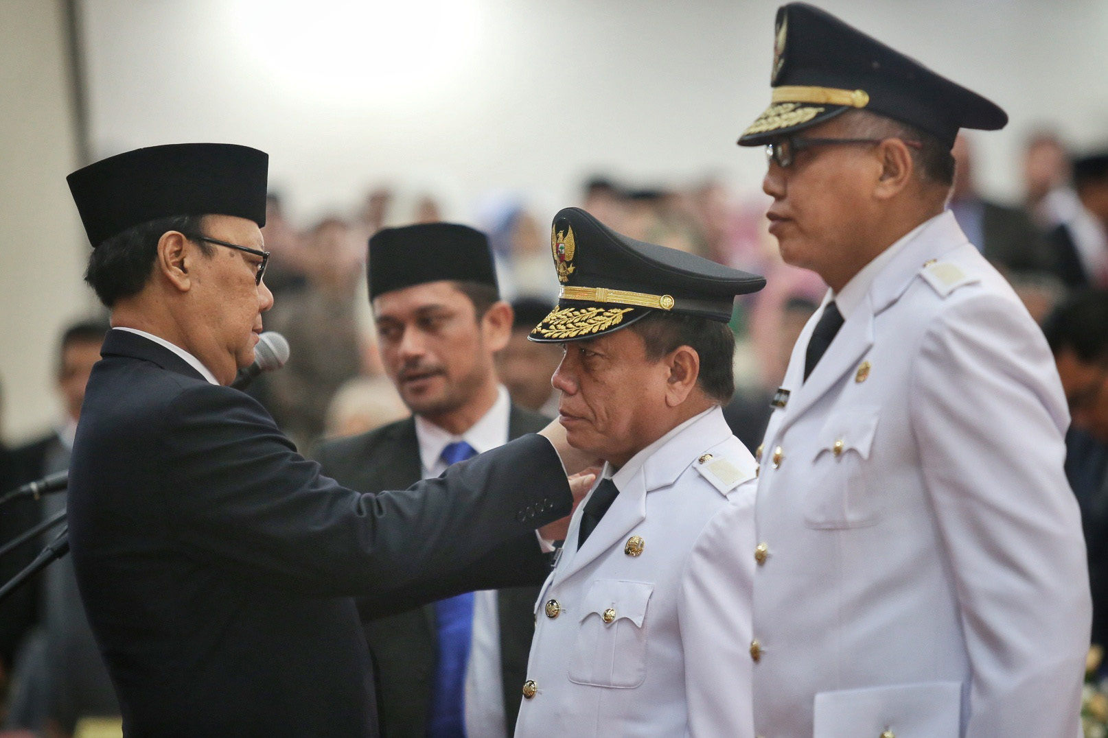 Menteri Dalam Negeri Republik Indonesia, Tjahjo Kumolo memasang tanda jabatan kepada Gubernur Aceh, Irwandi Yusuf saat prosesi pelantikan Gubernur/Wakil Gubernur periode 2017-2022 di Ruang Paripurna DPRA, Banda Aceh, Rabu 5 Juli 2017.