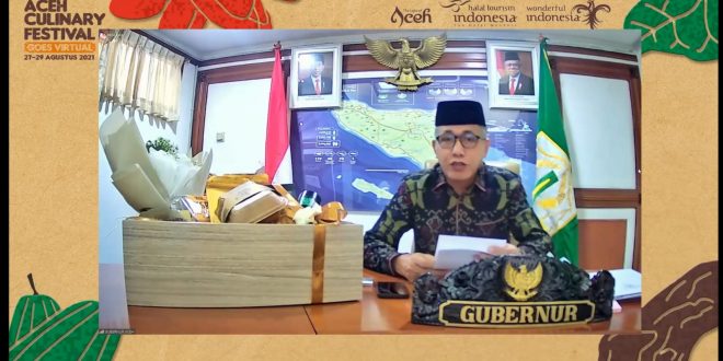 BANDA ACEH – Menteri Pariwisata dan Ekonomi Kreatif (Menparekraf) Indonesia Sandiaga Uno, membuka secara virtual acara Aceh Culinary Festival Tahun 2021 pada Jumat, 27/8/2021. Agenda tahunan Pemerintah Aceh melalui Dinas Kebudayaan dan Pariwisata tersebut digelar secara virtual pada tahun ini mengingat pandemi covid-19 masih melanda.