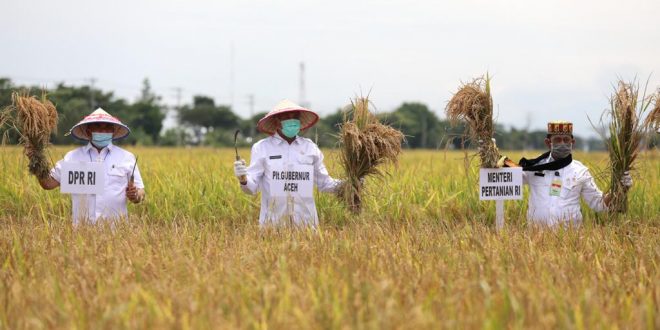 Menteri Pertanian RI, Syahrul Yasin Limpo, bersama Plt Gubernur Aceh, Nova Iriansyah, melakukan panen raya musim tanam gadu 2020, di Gampong Tumbo Baro, Kuta Malaka, Aceh Besar, Rabu, (30/9/2020).