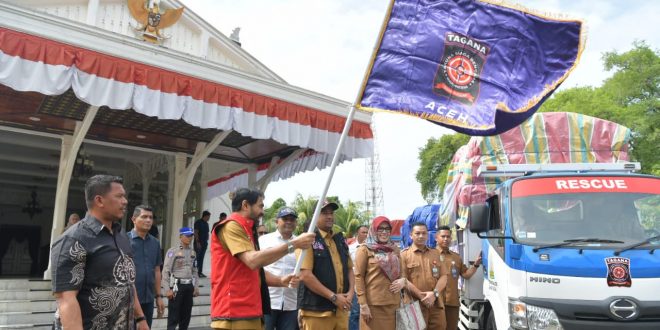 Banda Aceh– Gubernur Aceh Muzakir Manaf atau Mualem melepas secara simbolis sepuluh truk bantuan logistik bencana untuk sejumlah kabupaten di Aceh. Prosesi pelepasan berlangsung di halaman Meuligoe Gubernur Aceh, Banda Aceh, Selasa (18/11/2025).