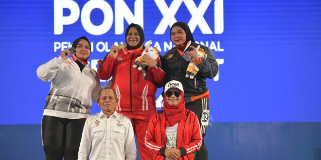 BANDA ACEH – Atlet Cabang Olahraga Angkat kebanggaan Aceh Nurul Akmal, berhasil merebut medali emas, setelah mencatatkan angkatan terberat, pada babak final.