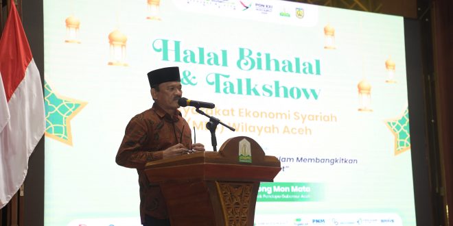 BANDA ACEH – Pemerintah Aceh mengapresiasi dukungan Pengurus Wilayah Masyarakat Ekonomi Syariah (MES) Aceh, yang telah mendukung upaya menyukseskan gelaran Pekan Olahraga Nasional (PON) XXI Aceh-Sumut 2024, dengan menggelar Talkshow yang mengangkat tema ‘Spirit PON XXI Aceh-Sumut, Dalam Membangkitkan Ekonomi Ummat’ pada kegiatan Halal bi Halal ini.