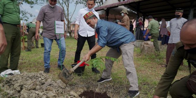 Kadisdik Dayah Aceh, Zahrol Fajri melakukan penanaman pohon dalam rangka Penghijauan Berbasis Pemberdayaan Dayah Tahun 2021 yang diselenggarakan DLHK Aceh di Dayah Perbatasan Manarul Islam, Aceh Tamiang, Selasa (28/12/2021).