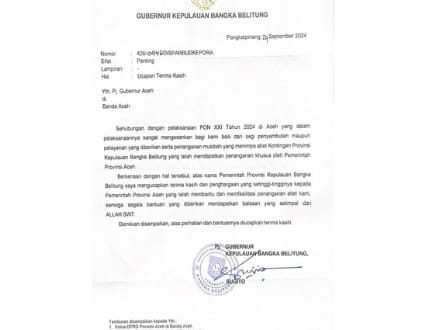 Dalam surat tersebut, Pemerintah Bangka Belitung mengungkapkan kesan mendalam atas perhatian dan tindakan cepat yang diberikan oleh Pemerintah Aceh terhadap kontingen mereka.