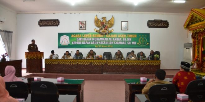 IDI – Pemerintah Kabupaten Aceh Timur menggelar prosesi lepas sambut Kepala Kejaksaan Negeri (Kajari) Aceh Timur dari sebelumnya dijabat M. Ali Akbar, SH. MH (sekarang menjadi Kajari Kota Lhoksemawe) kepada Kajari yang baru Abun Hasbulloh Syambas, SH. MH. Prosesi tersebut berlangsung di aula Gedung Serbaguna, Pendopo Idi, Selasa 27 maret 2018.