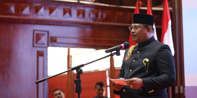 Pj. Gubernur Aceh, Dr. H. Safrizal ZA, M.Si, memberikan sambutan saat menghadiri rangkaian kegiatan Peringatan Hari Ibu ke-96 tahun 2024, di Anjong Mon Mata, Banda Aceh, Selasa, (17/12/2024).