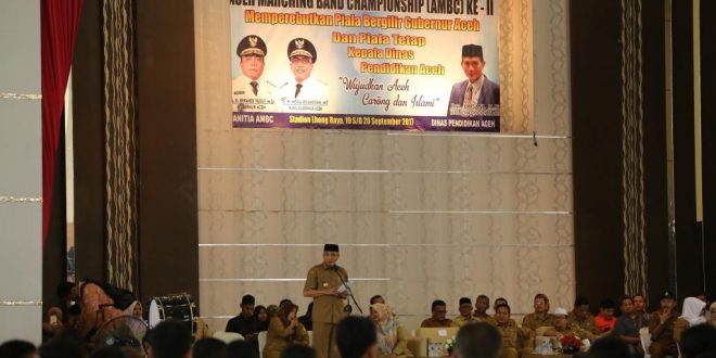 BANDA ACEH-Sejumlah pelajar dari berbagai jenjang pendidikan dan umum, turut memeriahkan Aceh Marching Band Campionship (AMBC) tahun 2017.Kegiatan yang berlangsung selama dua hari atau sejak 19 hingga 20 September 2017, dipusatkan di Stadion Lhoong Raya Banda Aceh dan dibuka langsung oleh Wakil Gubernur Aceh, Nova Iriansyah, Selasa (19/09/2017).