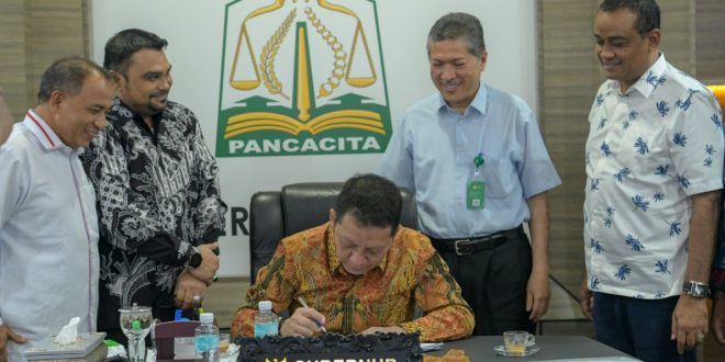 BANDA ACEH – Penjabat Gubernur Aceh Acmad Marzuki, menandatangani SK Penentuan Lokasi Venue dan Usulan SK Panitia PB PON Aceh-Sumut Wilayah Aceh, di ruang kerja Meuligoe Gubernur Aceh, Kamis (14/7/2022).